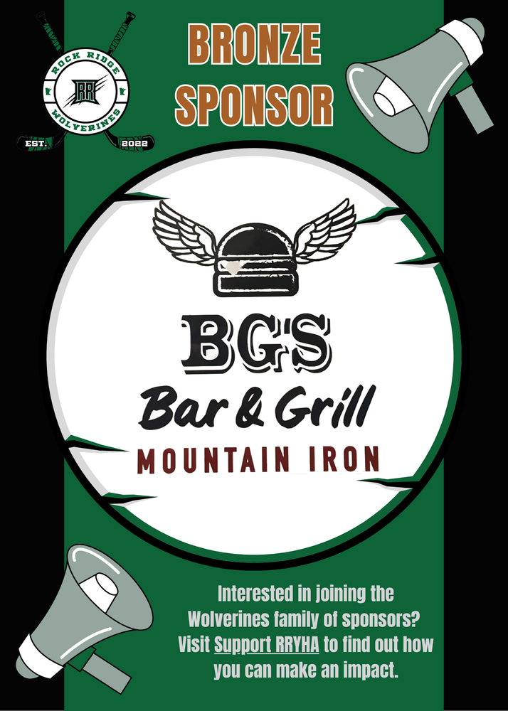 Rock Ridge Youth Hockey Association is excited to welcome BG’s Bar & Grill of Mt. Iron as a Bronze Sponsor for the 2025–26 season! Their support helps provide valuable resources that directly benefit our players, families, and programs.