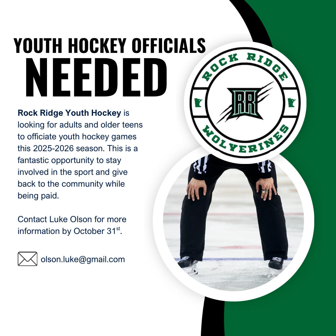 Love hockey and want to be part of the game in a whole new way? Rock Ridge Youth Hockey Association (RRYHA) is looking for referees! This is a great opportunity to stay involved in the sport, develop leadership skills, and earn extra cash while ensuring the game is played safely and fairly.