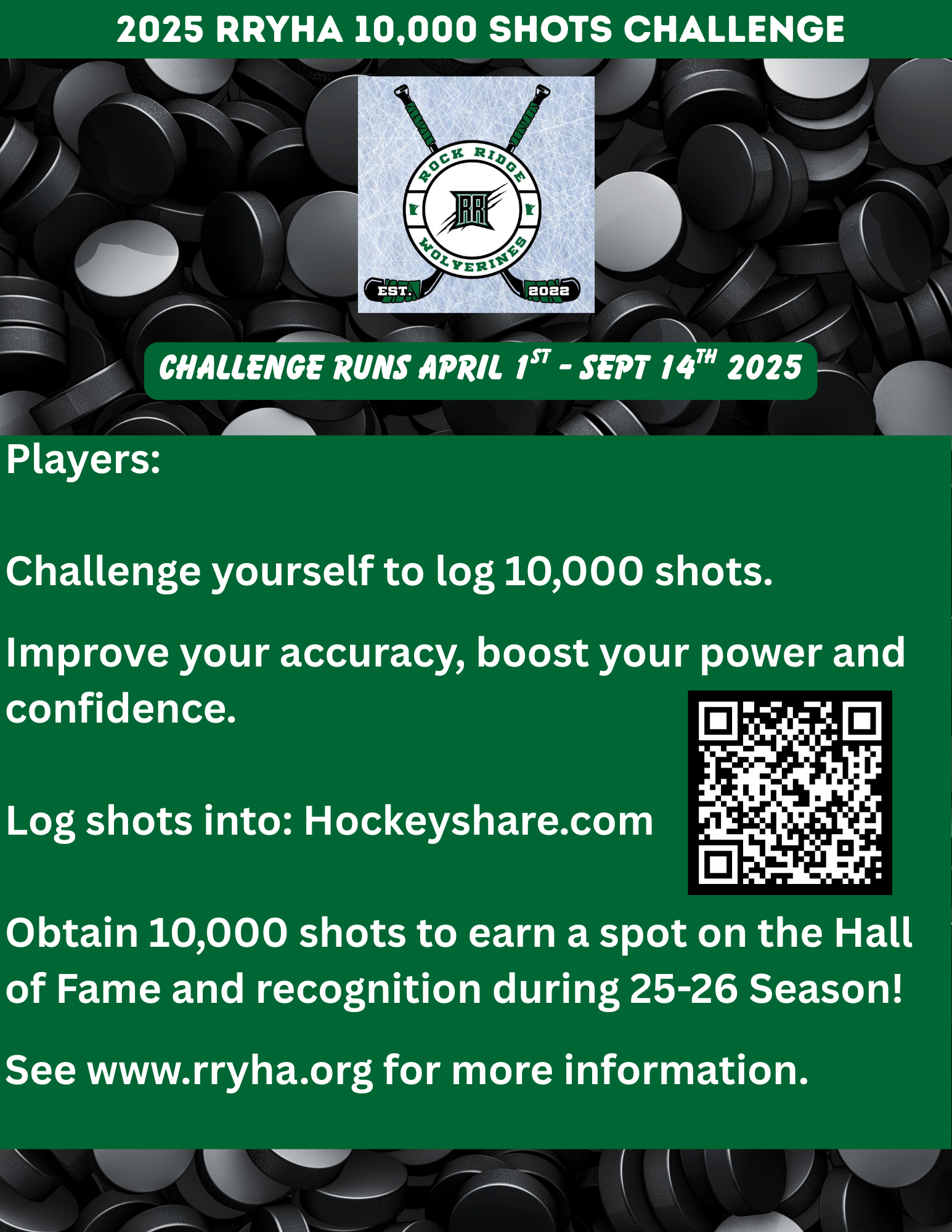 The Rock Ridge Youth Hockey Association (RRYHA) challenges players to level up their game with the 10,000 Shots Challenge! This fun and rewarding program pushes players to sharpen their shooting skills by taking 10,000 shots at home throughout the season. As they fire away, players track their progress and submit their totals, working toward an epic goal. Those who hit the 10,000 mark earn well-deserved recognition and bragging rights! More than just a challenge, it’s a chance to build strength, accuracy, and confidence—all while having a blast. So, grab your stick, hit the net, and let’s see those shots fly!